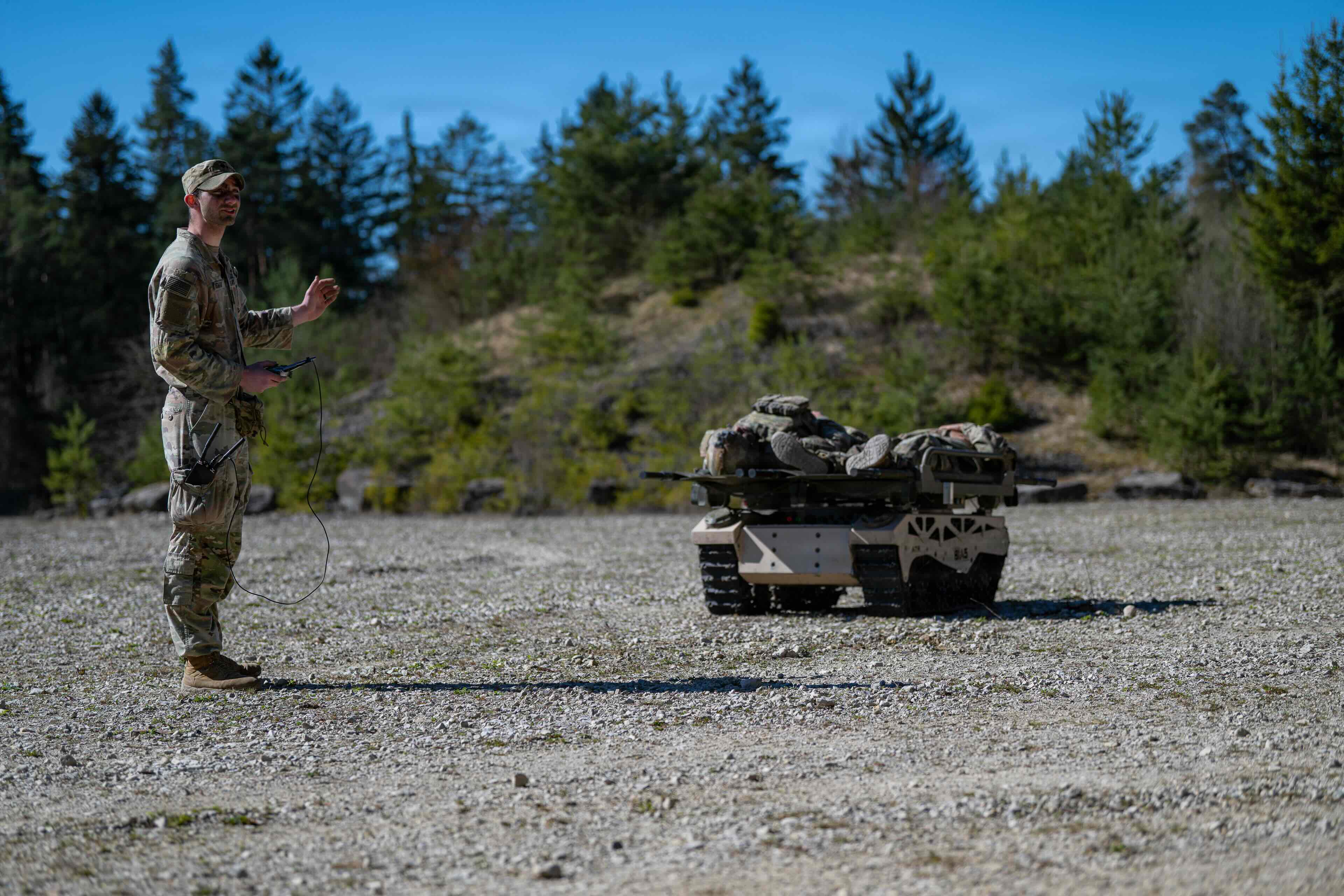In early April, soldiers assigned to the 101st Airborne Division used the HDT Expeditionary Systems Hunter Wolf, an all-terrain UGV capable of carrying 2,800 pounds of supplies, during training at the Joint Readiness Training Center at Fort Johnson, Louisiana. A separate version of the platform fielded at that exercise carried a remotely operated .50-caliber machine gun.