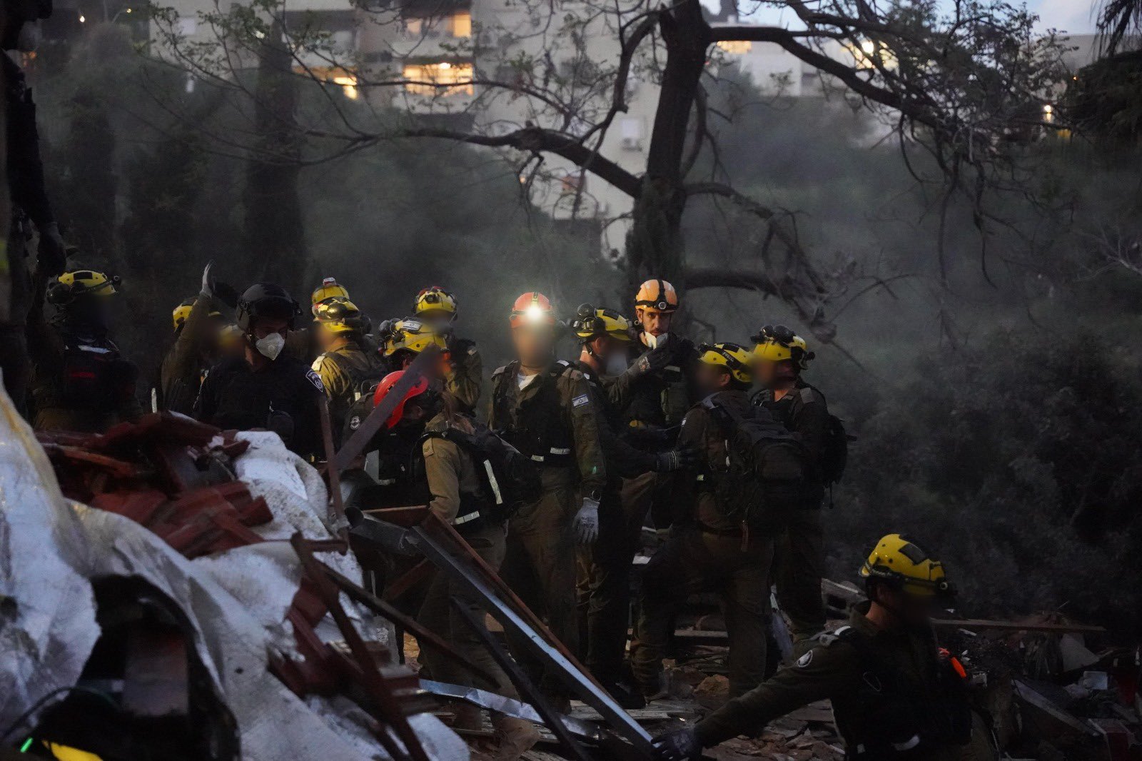 Israel Police Commissioner Danny Levy confirmed at the scene that the warhead may not have detonated on impact. “We evacuated several buildings, so that, in the unlikely case that the missile explodes, nobody will be hurt,” he said. “Our sappers are handling the matter.” Rescue teams, he added, were “focusing all efforts on the four who are supposed to be here, using all means at our disposal.”