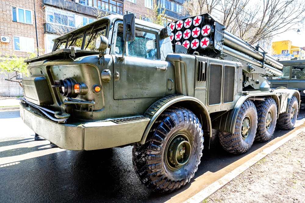 The BM-27 Uragan, a Soviet-designed 220 mm system mounted on a ZIL-135 chassis, can fire a wide range of munitions, including high-explosive fragmentation warheads and scatterable mines, in under nine seconds at ranges of up to 35 kilometers (22 miles).