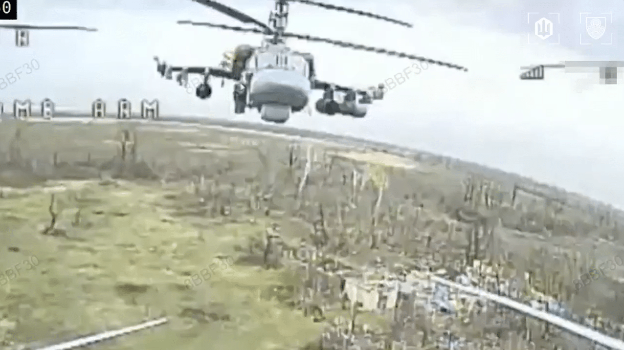 Drone footage shows operators initially tracking a second helicopter, which stayed out of range. When the Ka-52 closed the distance, the crew guided the FPV munition into the aircraft’s wing-mounted weapons pylon.
